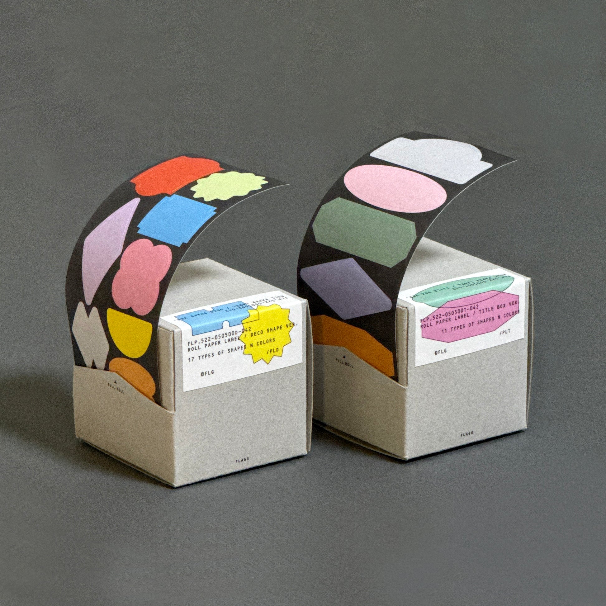 A series of paper roll labels with 11 types of unique "title box" and colours.