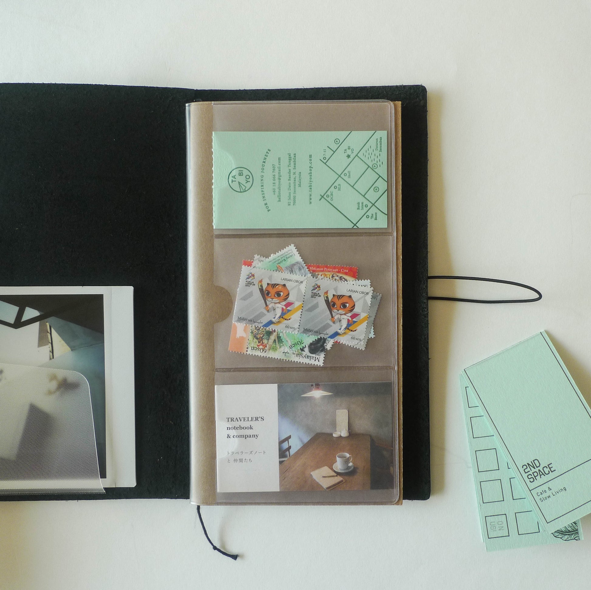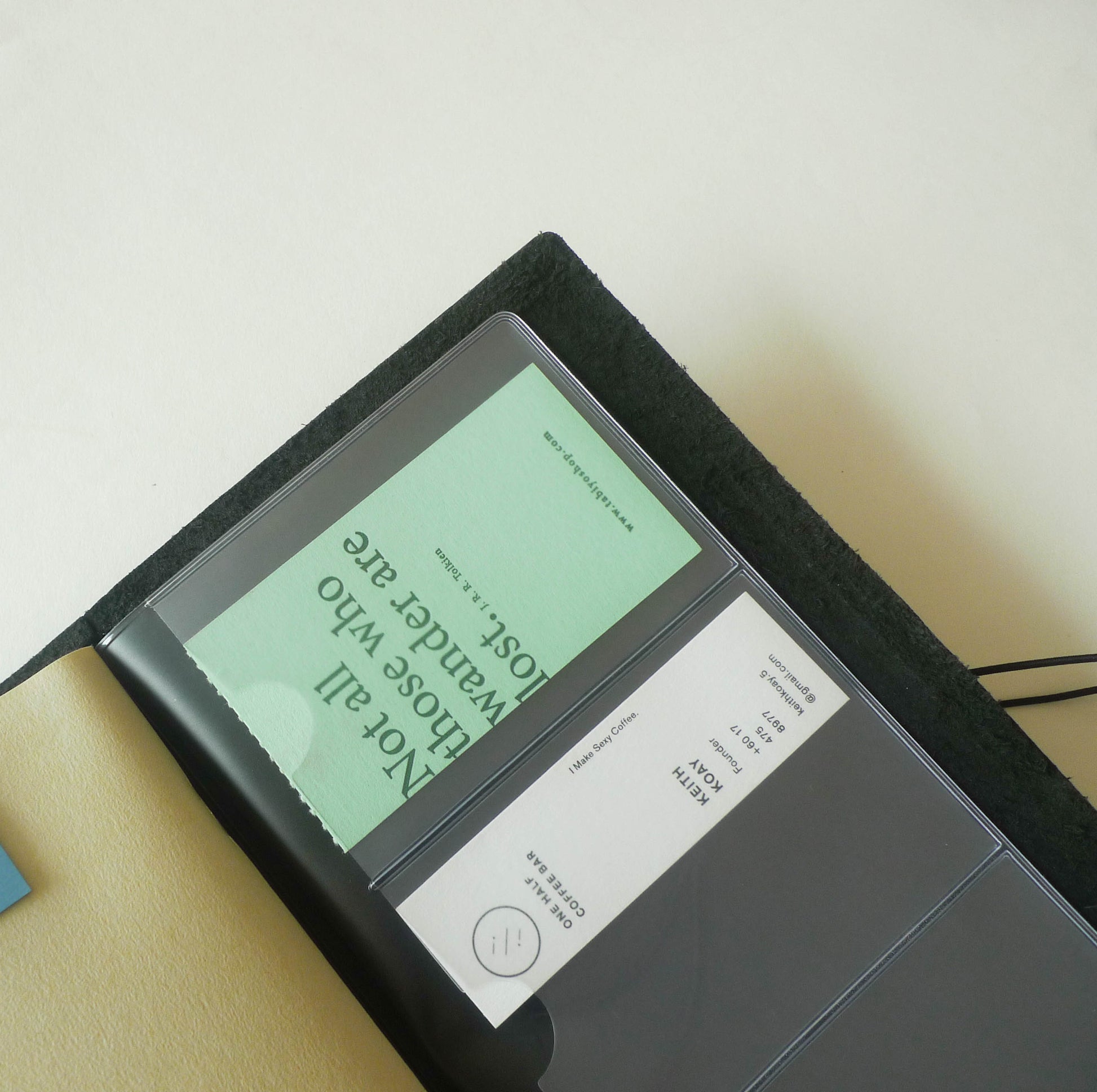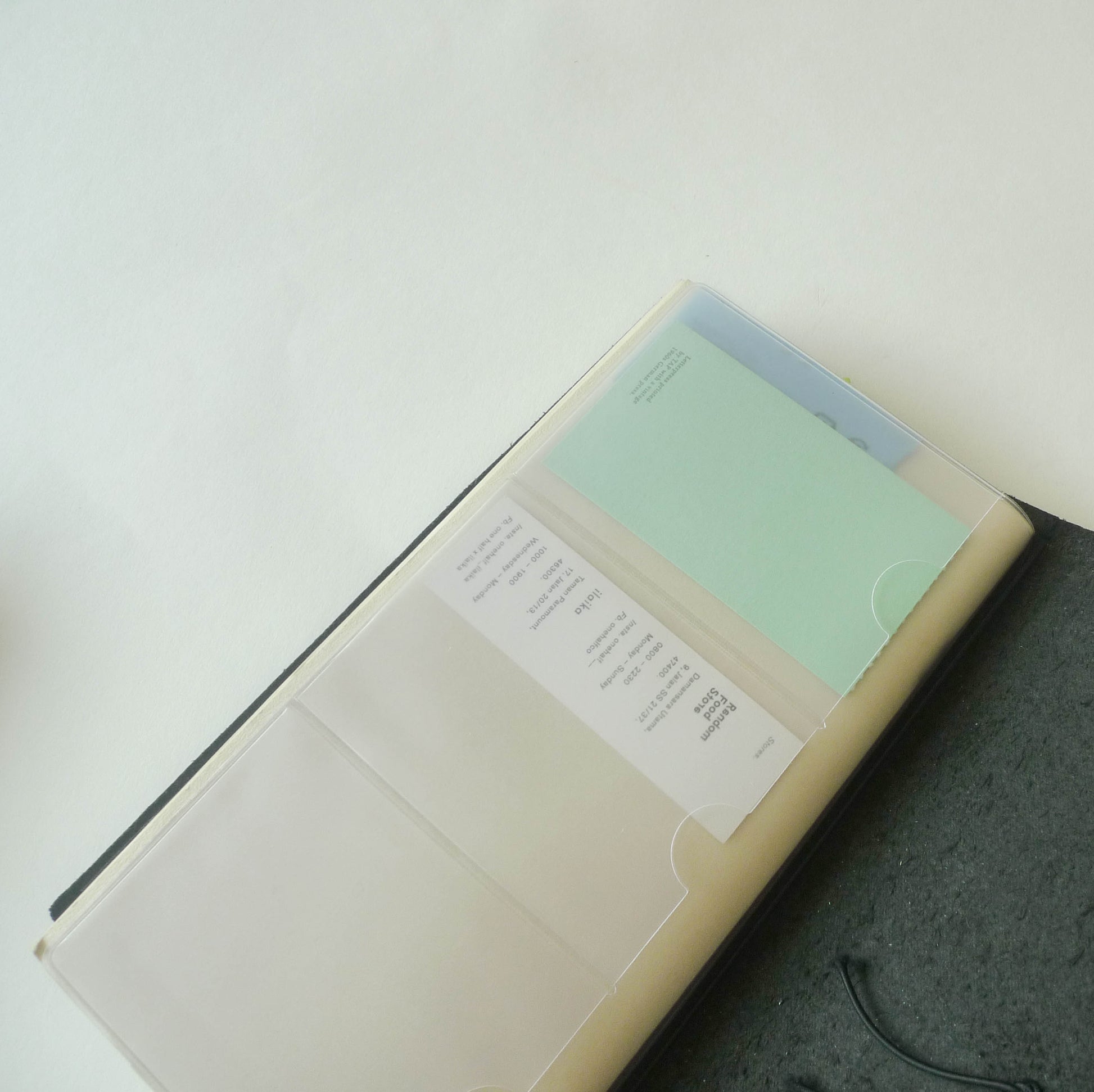 A clear PVC insert with 12 business card sized pockets. Slip any of its 4 pages between the cover and refill of your TRAVELER'S notebook (Regular Size). Suitable for storing and organising small, flat objects neatly, freeing up space in your wallet and keeping them safe.