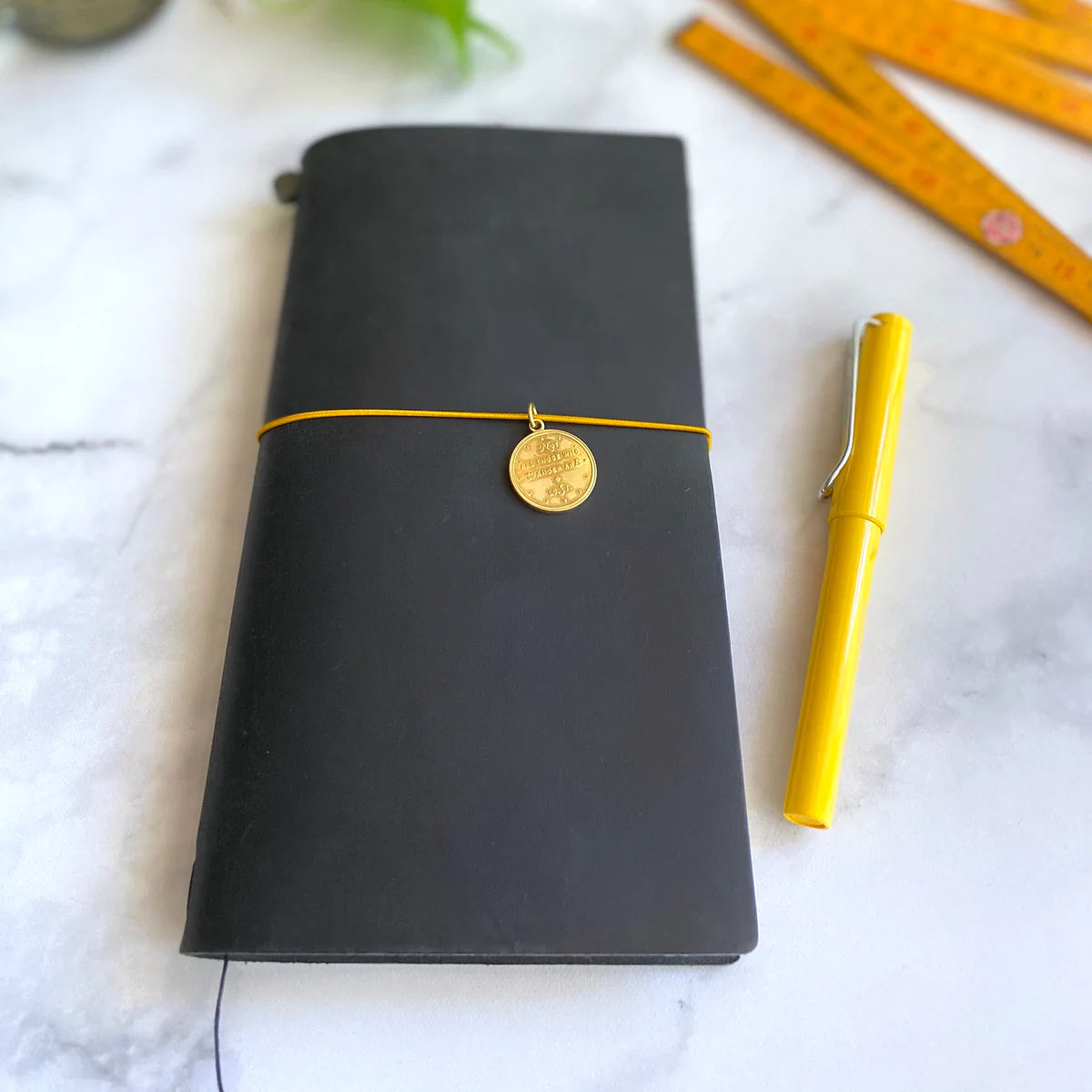 Each brass charm is pressed with the "Not All Those Who Wander are Lost" quote on the front and BK logo on the back. The charm will surely inspire you every time you open your TRAVELER'S Notebook.