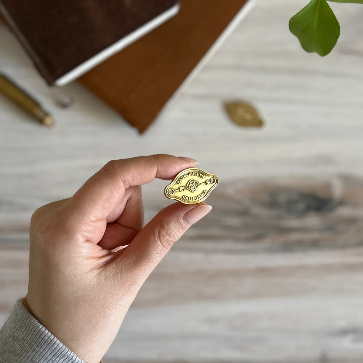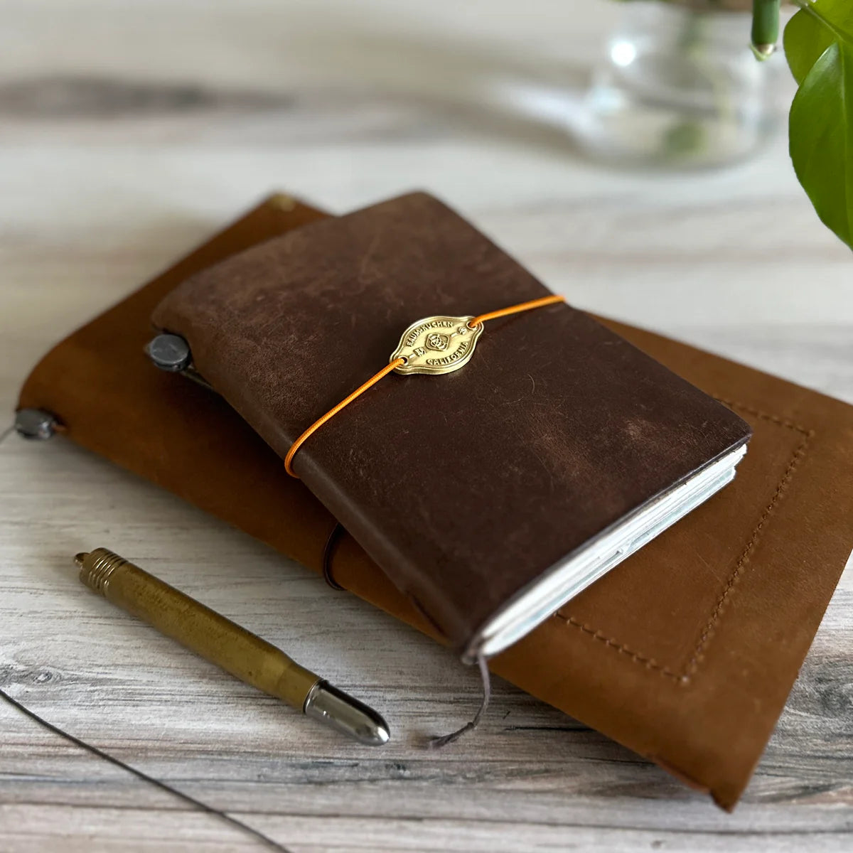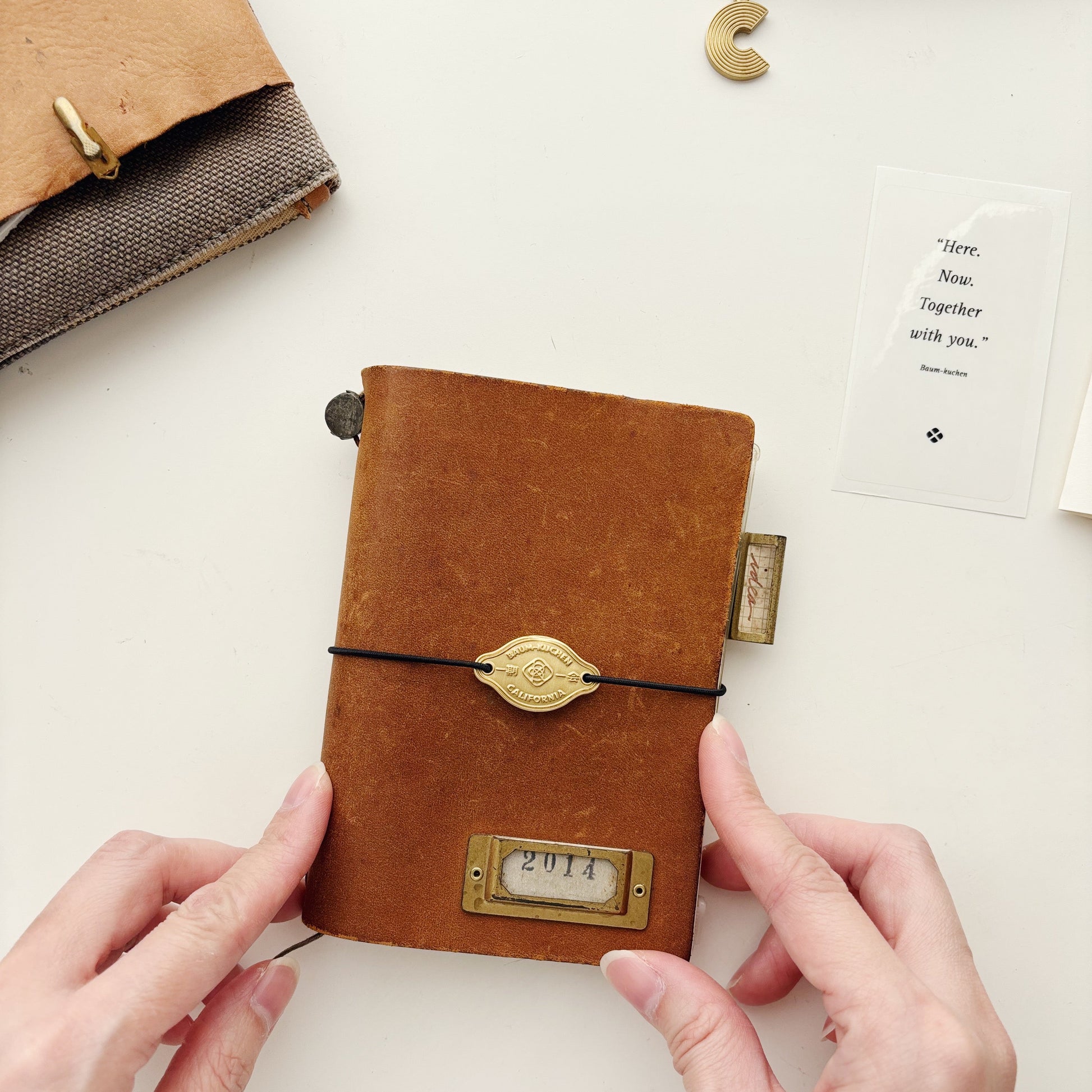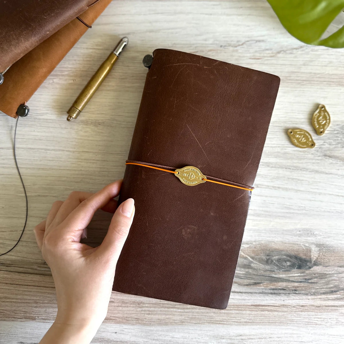 The brass plate can be easily attached to your TRAVELER'S notebook's elastic band, or sew it directly to your cover.