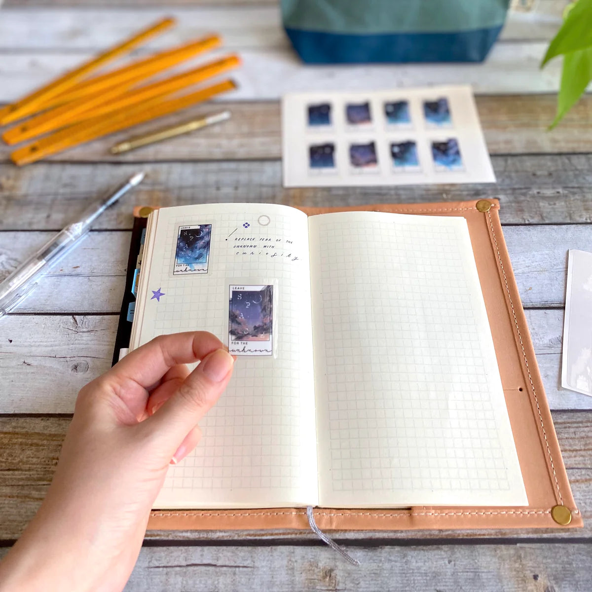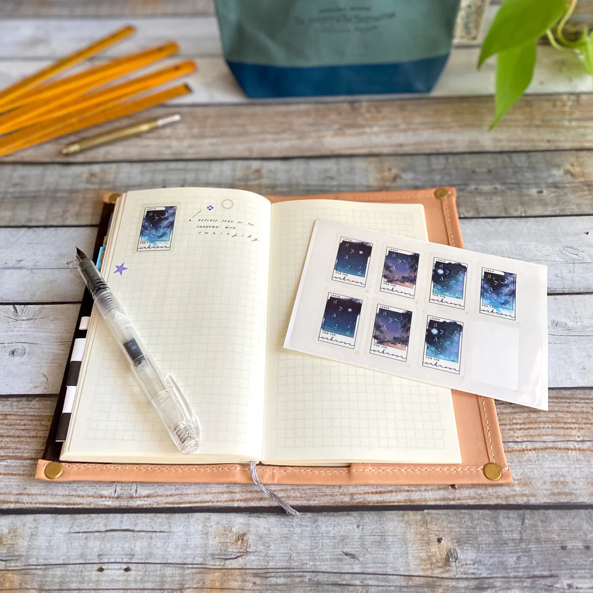 The essence of "Leave Space for the Unknown" came to BK in 2019 during a perfect camp night at a beautiful California beach. BK team member Emil created original paintings using the traditional gouache technique. Each sticker sheet contains four different night skies, each with a unique mood. We hope the endless possibility of the "space" spilling out of the frame inspires you to imagine hopes and dreams for the future.